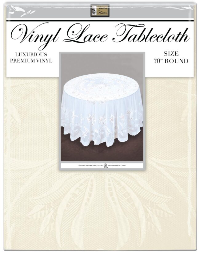 TABLECLOTH,VINYL LACE WT/BEIGE 70″ ROUND